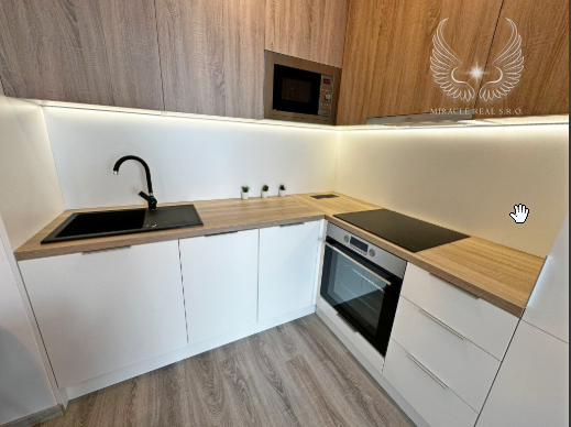 Byt je zariadený kvalitným nábytkom na mieru s dôrazom na praktickosť a nadštandardný úložný priestor. Kuchynská linka je vyrobená na mieru, doplnená LED osvetlením a modernými vstavanými spotrebičmi značiek Mora/Gorenje: