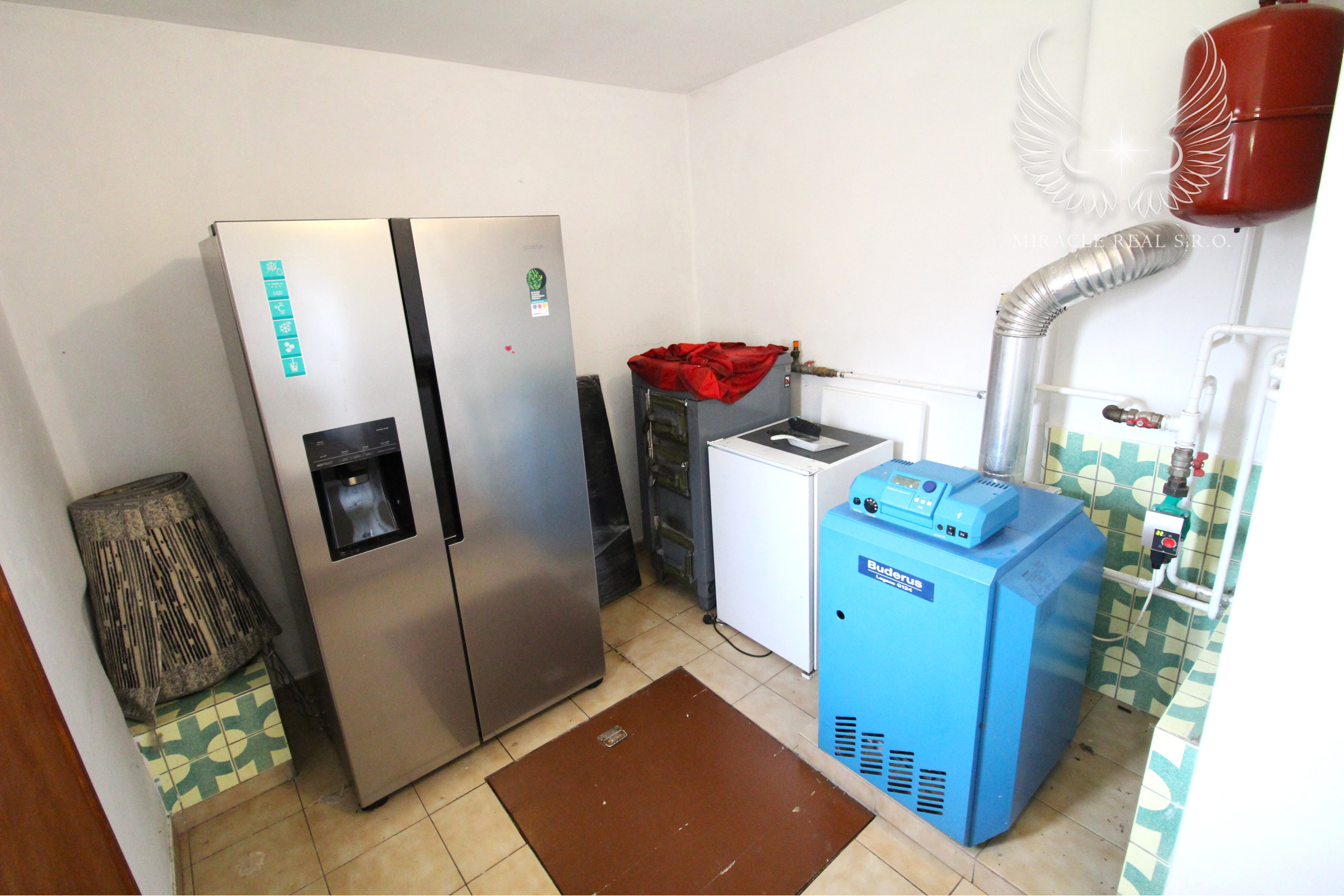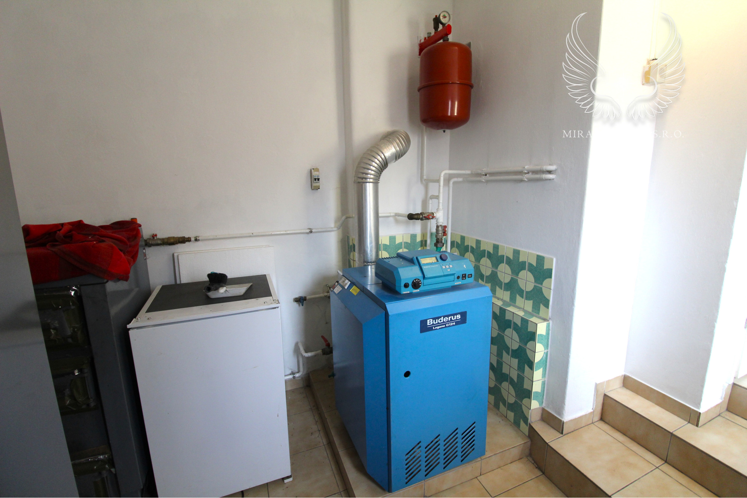 Za kuchyňou, v technickej miestnosti, ktorá je čiastočne podpivničená, sa nachádza plynový kotol na ohrev užitkovej vody a vody na vykurovanie, ktoré je zabezpečené radiátormi.